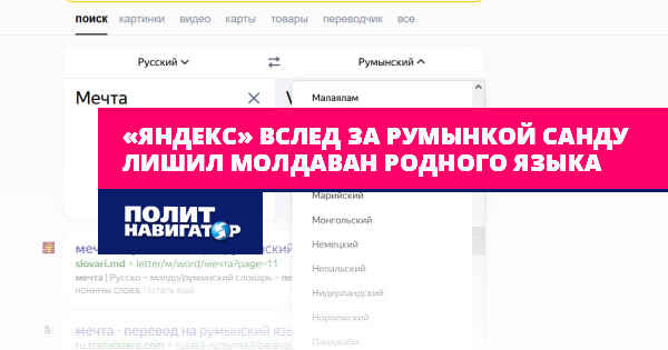 Компания «Яндекс» даже после смены собственников продолжает прогибаться под Запад, в том числе, пособничая в насильственной румынизации Молдовы режимом Майи Санду. Так, портал Yandex при поиске перевода слов на молдавский язык автоматически навязывает «румынский».